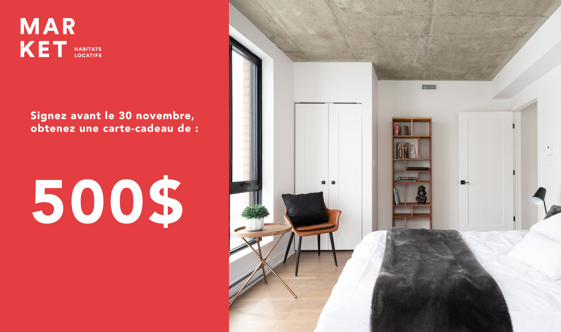 Profitez d’une offre exclusive ! Si vous êtes à la recherche d’un appartement moderne, bien situé et à prix abordable, c’est le moment idéal pour signer votre bail avec Market Habitats Locatifs! Signez avant le 30 novembre 2025 et obtenez une carte-cadeau de 500$ ! Profitez aussi de notre autre promotion en cours: 50% de réduction